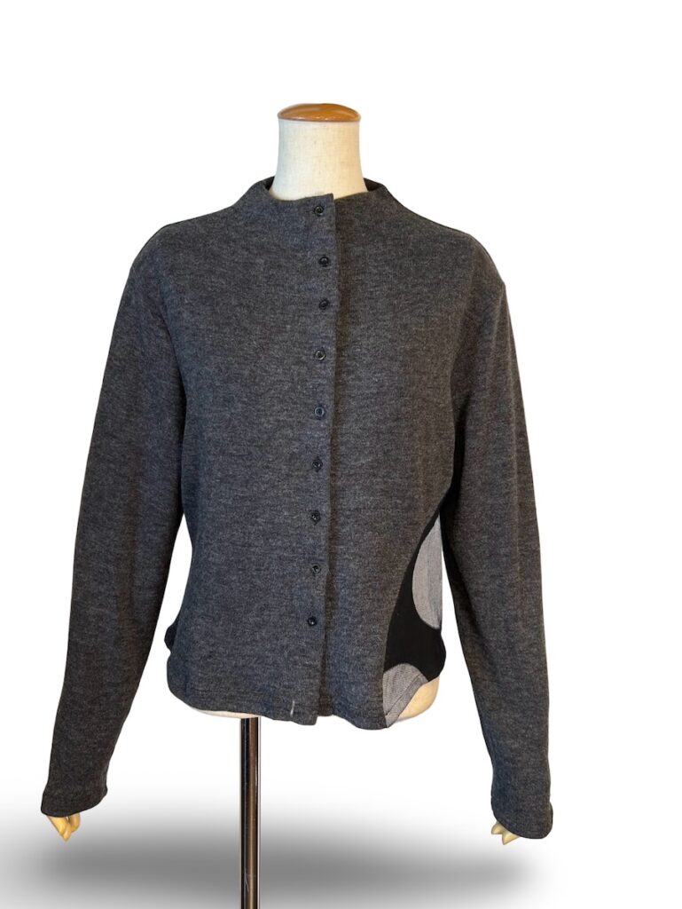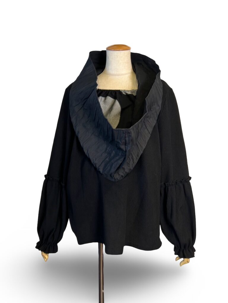 ニットの襟で暖かなトップスです。インナーに見えているのが水玉模様。