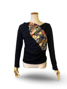 左脇に今回の花柄の生地を切り替えてありそしてそこにシャーリングをしてあります。