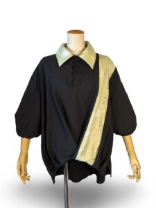 ノースリーブのトップスを。縦に切り替えた和柄がポイントになっているのですよね。そして、前のタックも面白いでしょ?