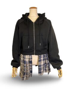 パーカーとシャツが合体したようなデザインのトップス。面白いでしょ?左脇にはプラスで雨雲ちゃんを。