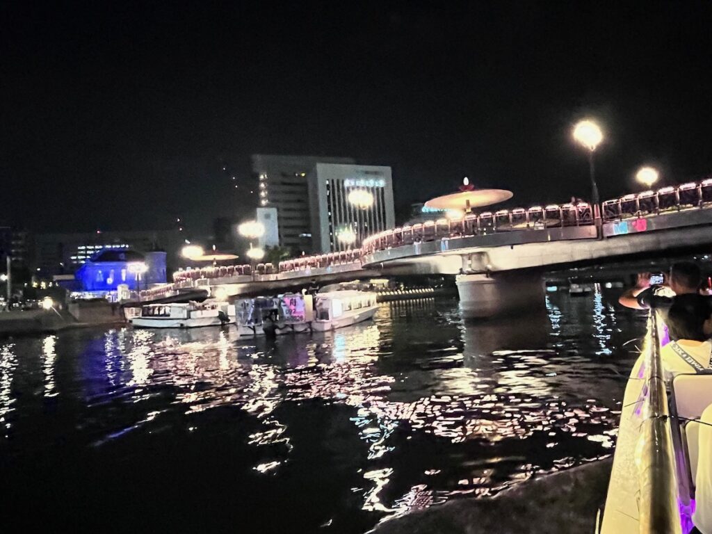 中洲の橋は、老若男女いろいろな国の人がたくさんいます。みんなに手を振って!!