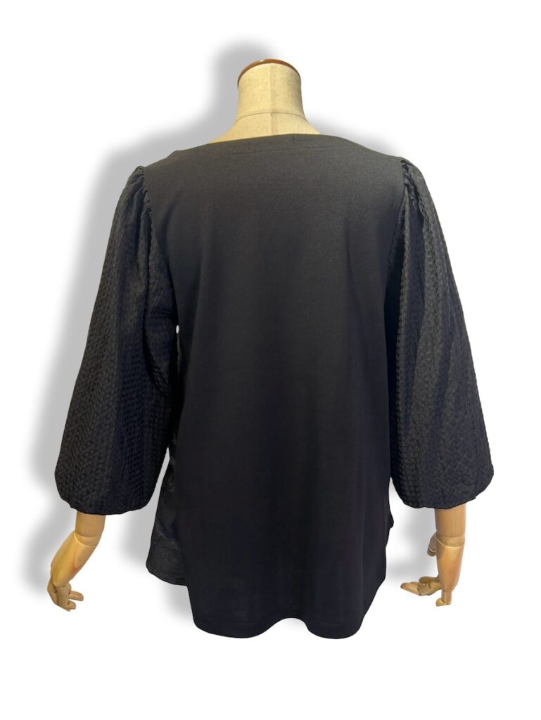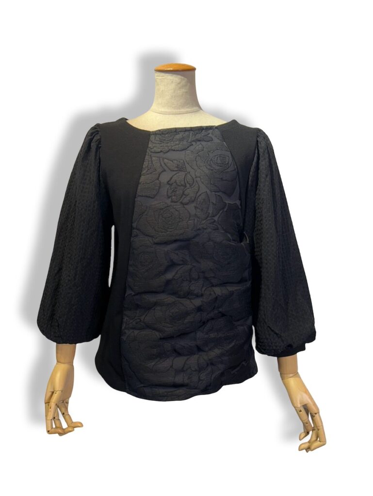 袖には、チェックの生地、前の切り替えにはバラの生地を使ったトップス。8分丈の袖も新鮮でしょ?