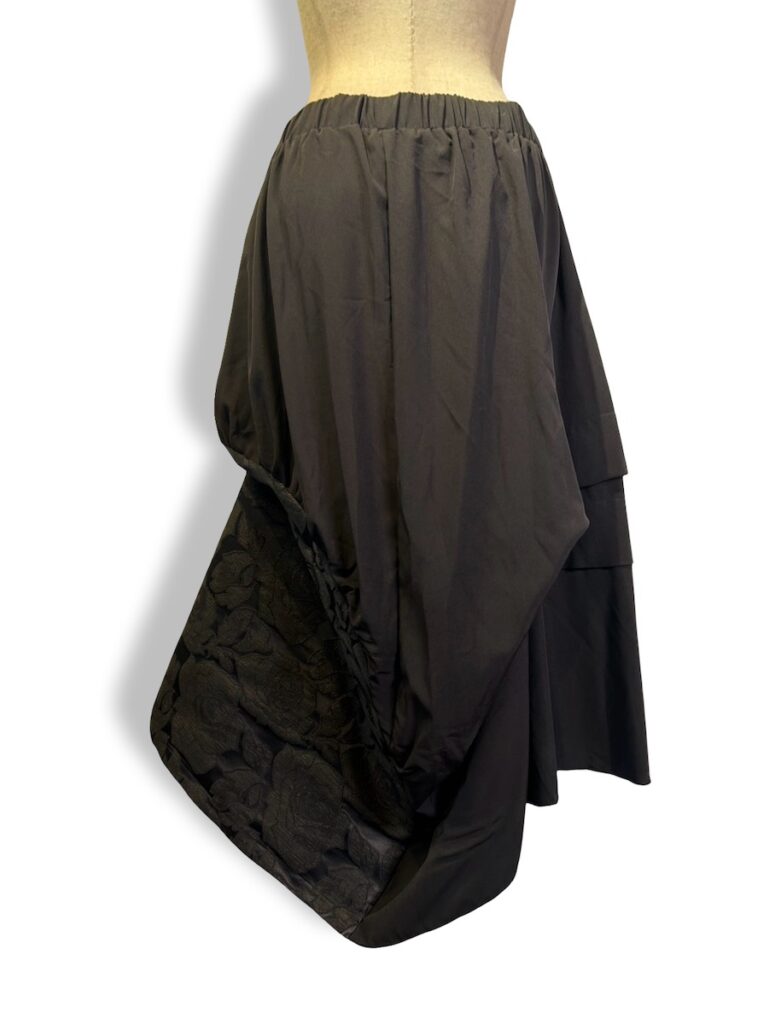 左裾部分にバラを使ったスカート。ボックスプリーツを入れてフレアーをたくさん入れて、それをバラの生地のところでまたタックで支えて。。。