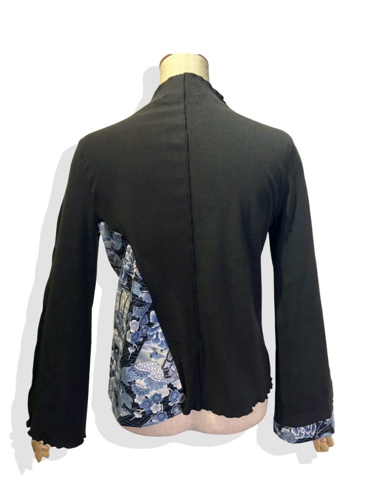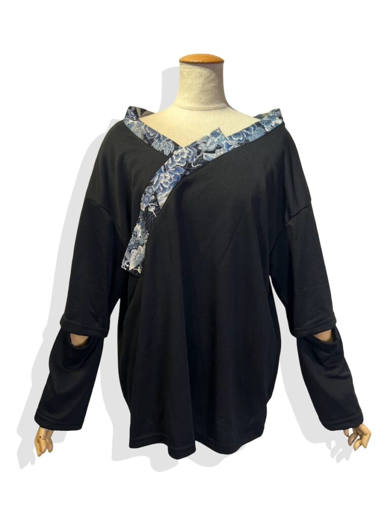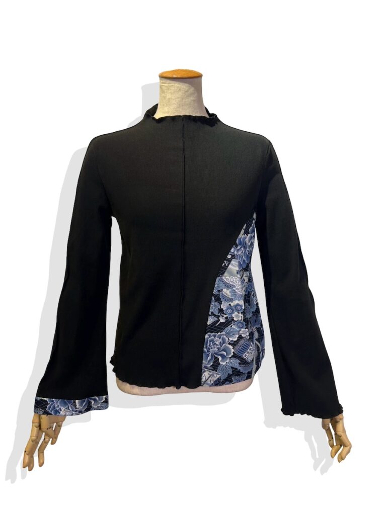 ハイネックのトップス。左脇と右袖口の和柄がポイント。
