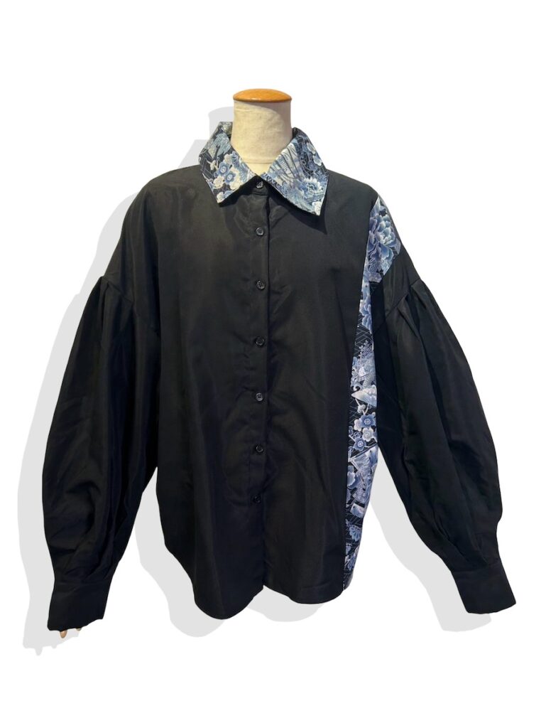 不思議なモコっとした袖のシャツ。襟と左脇が和柄になっております。