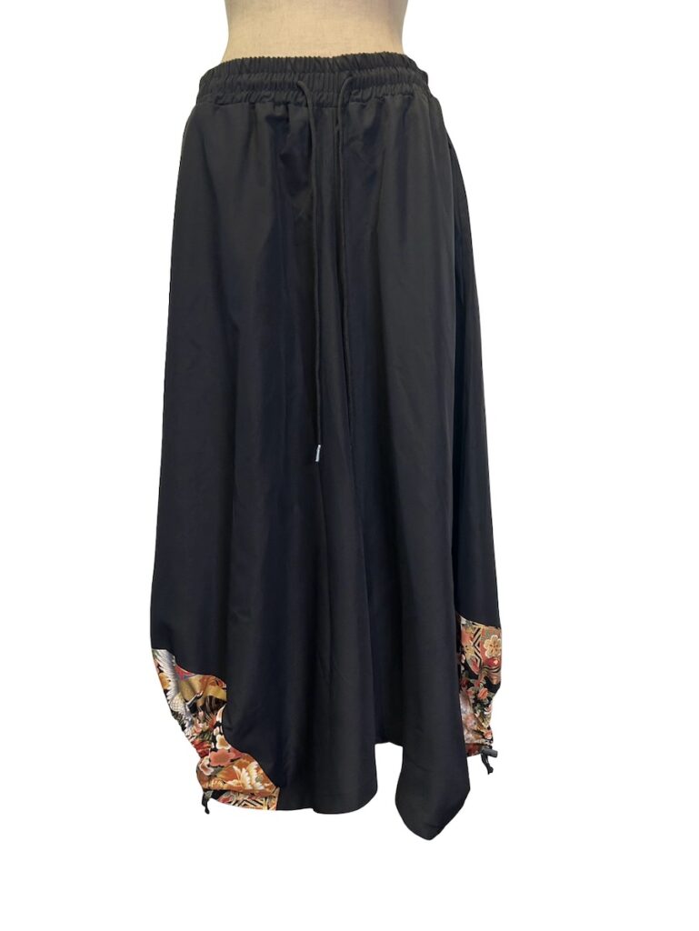 ウエストを剛と紐でキュッとするスカート。両脇にちらりと見える和柄がポイントです。