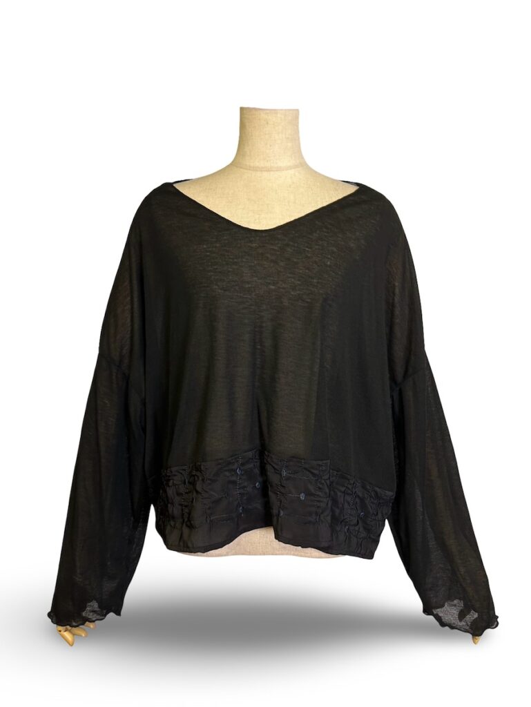 ちょっと広めなVのトップス。裾の切り替えがきゃわいいのよ。