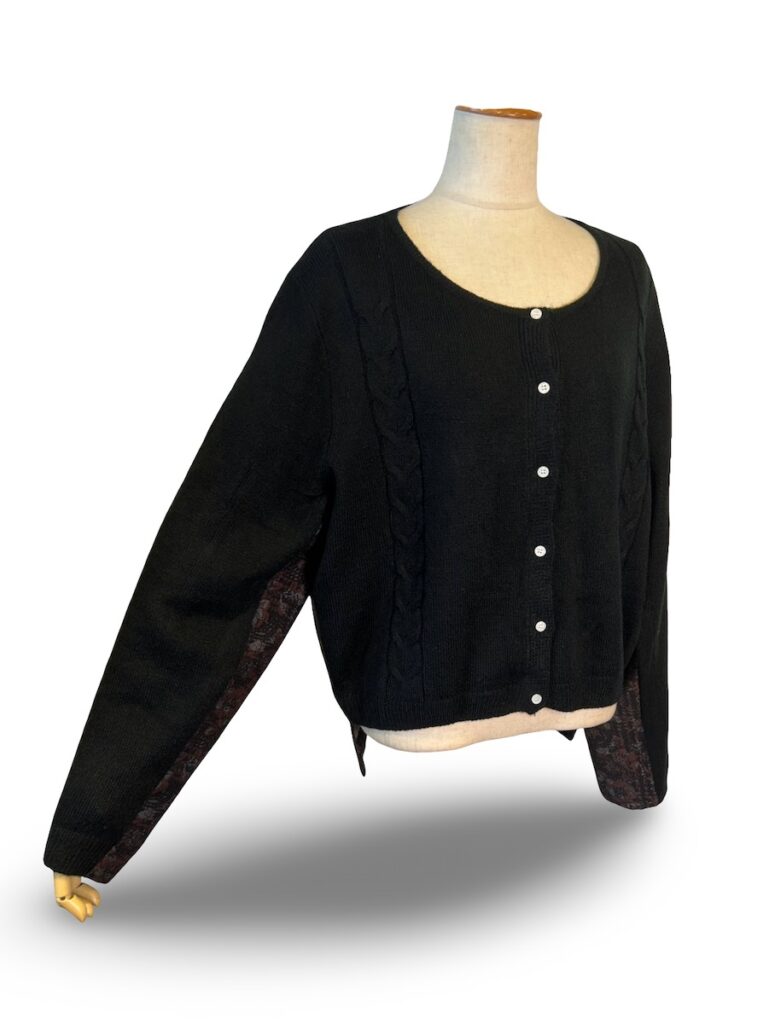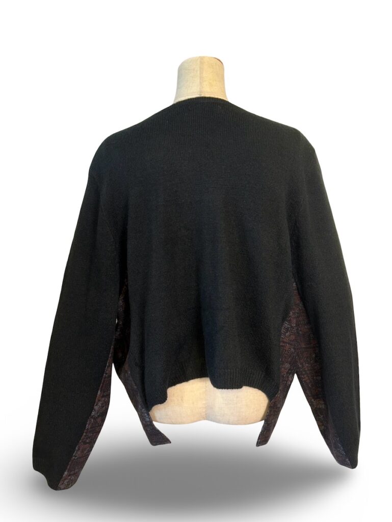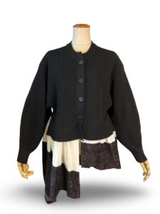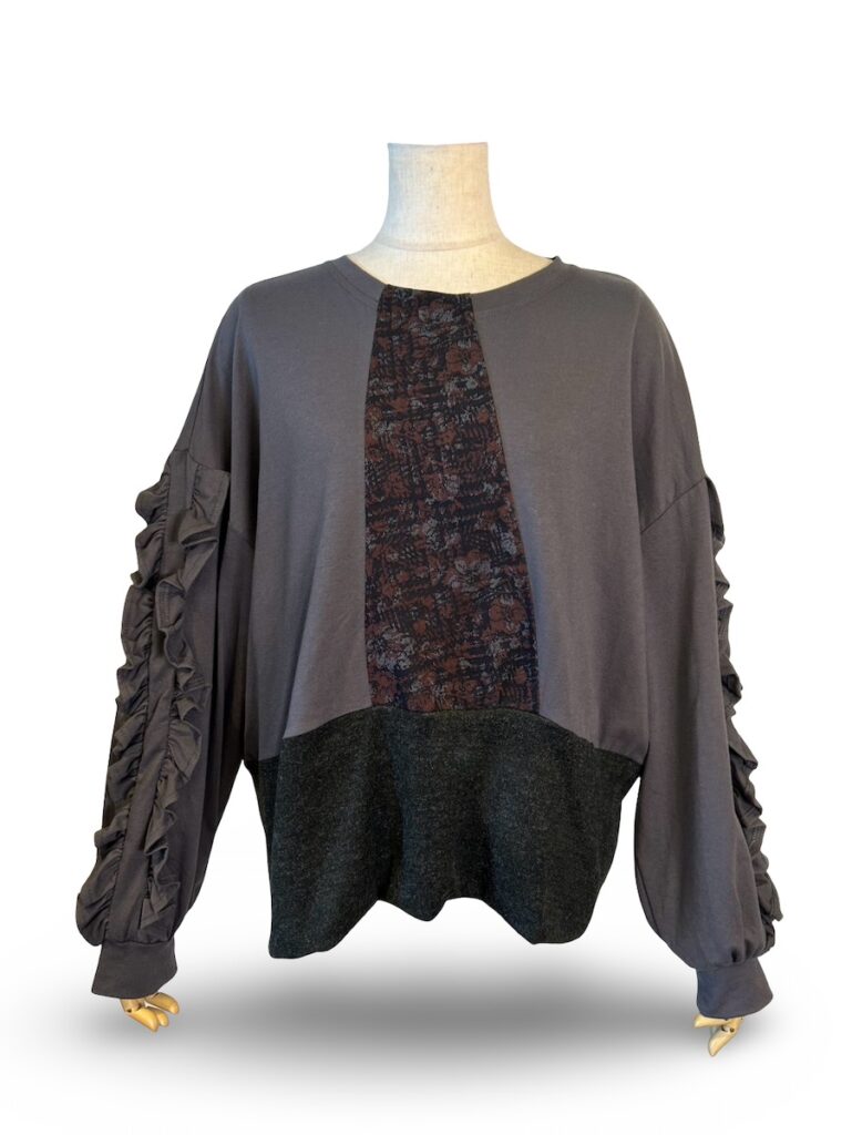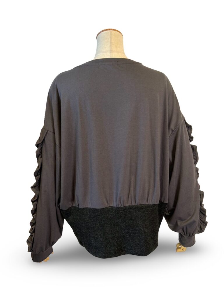 袖にぴらぴらとつけたトレーナー。前に切り替えが入っとります。