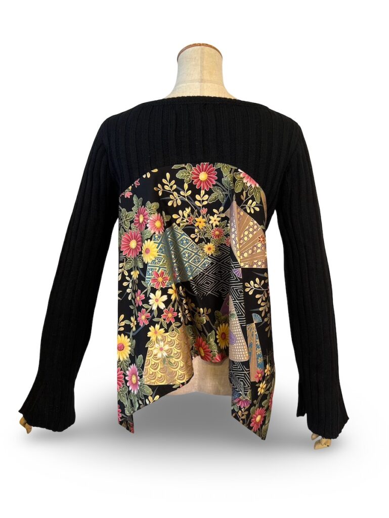 斜めに和柄と黒い生地を切り替えたトップス。ふわりとしたラインです。