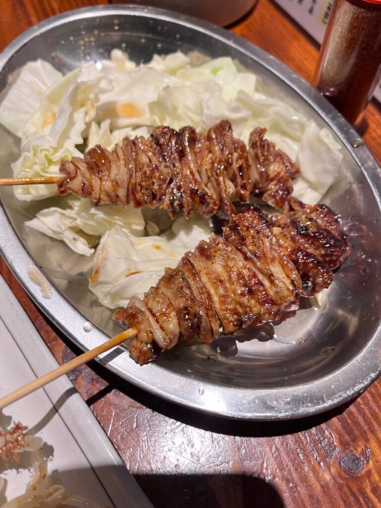 福岡の鶏皮ってくるくる巻いてあって何回も焼いて焼いて、、、油を落としているのでカリカリなんです。
