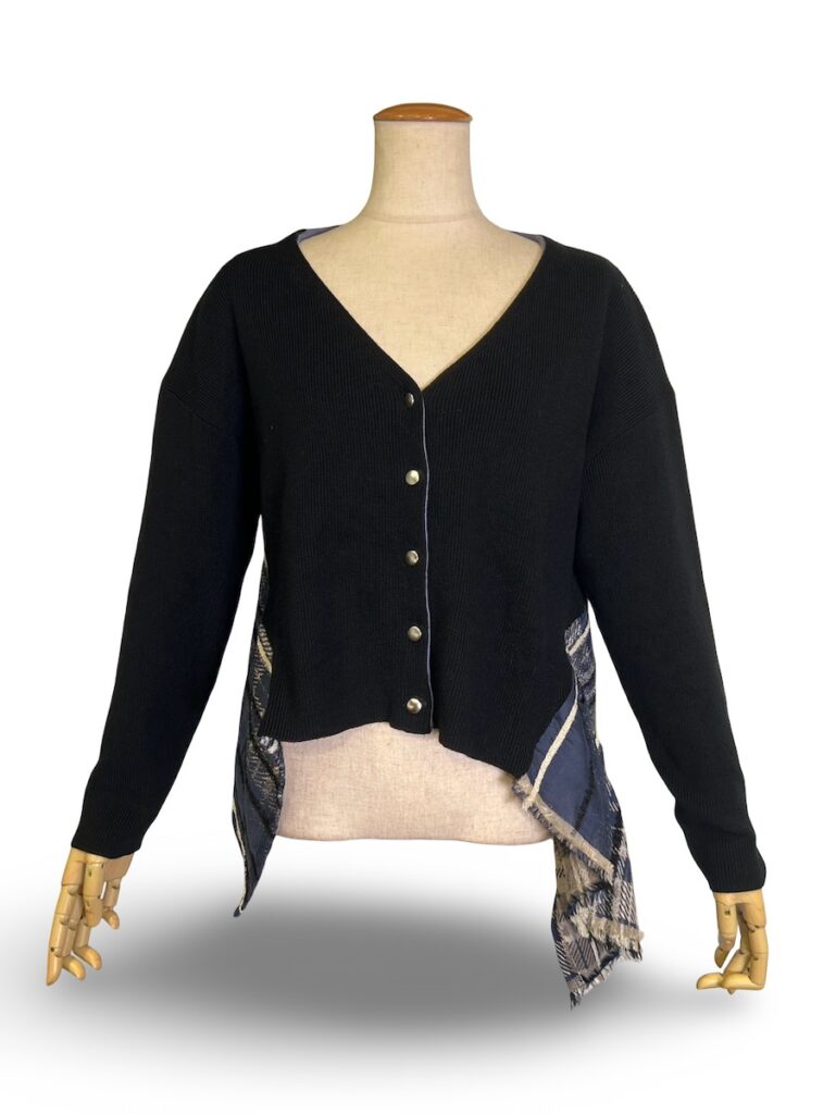 ひらひらとする裾のカーディガンを。左右で幅が違うのもポイント。