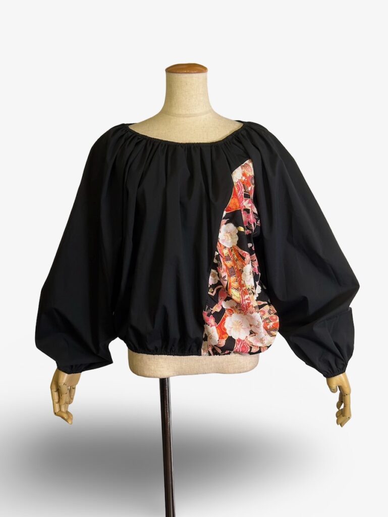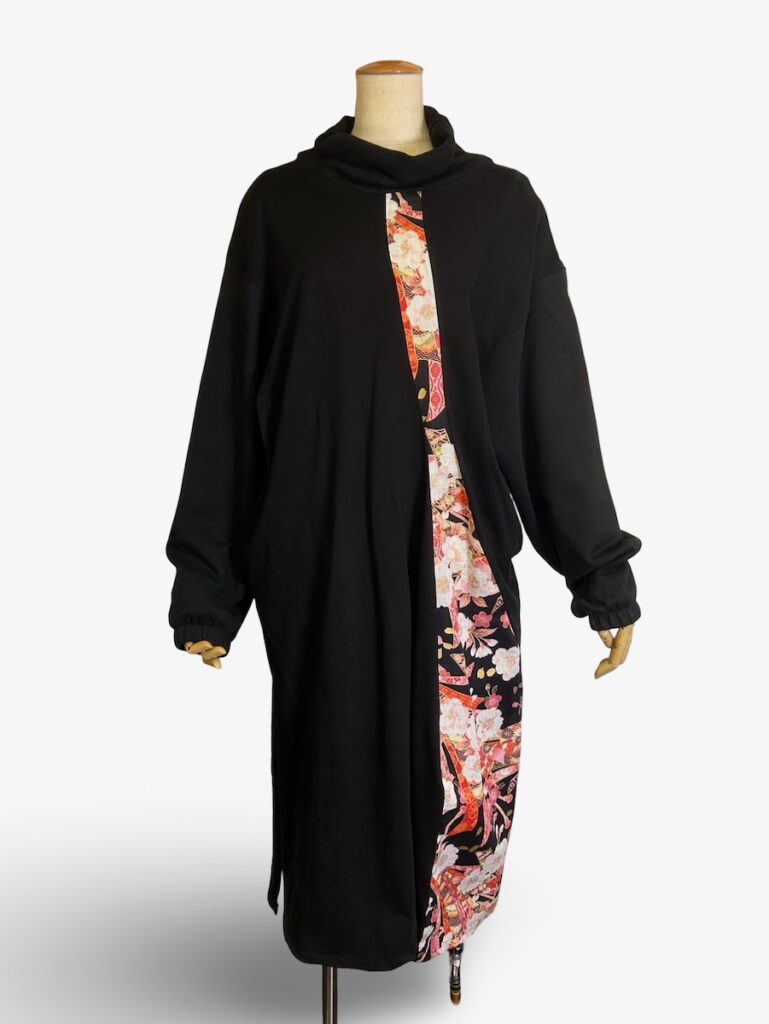 暖かめなトレーナー生地ワンピース。斜めに和柄が広がっております。