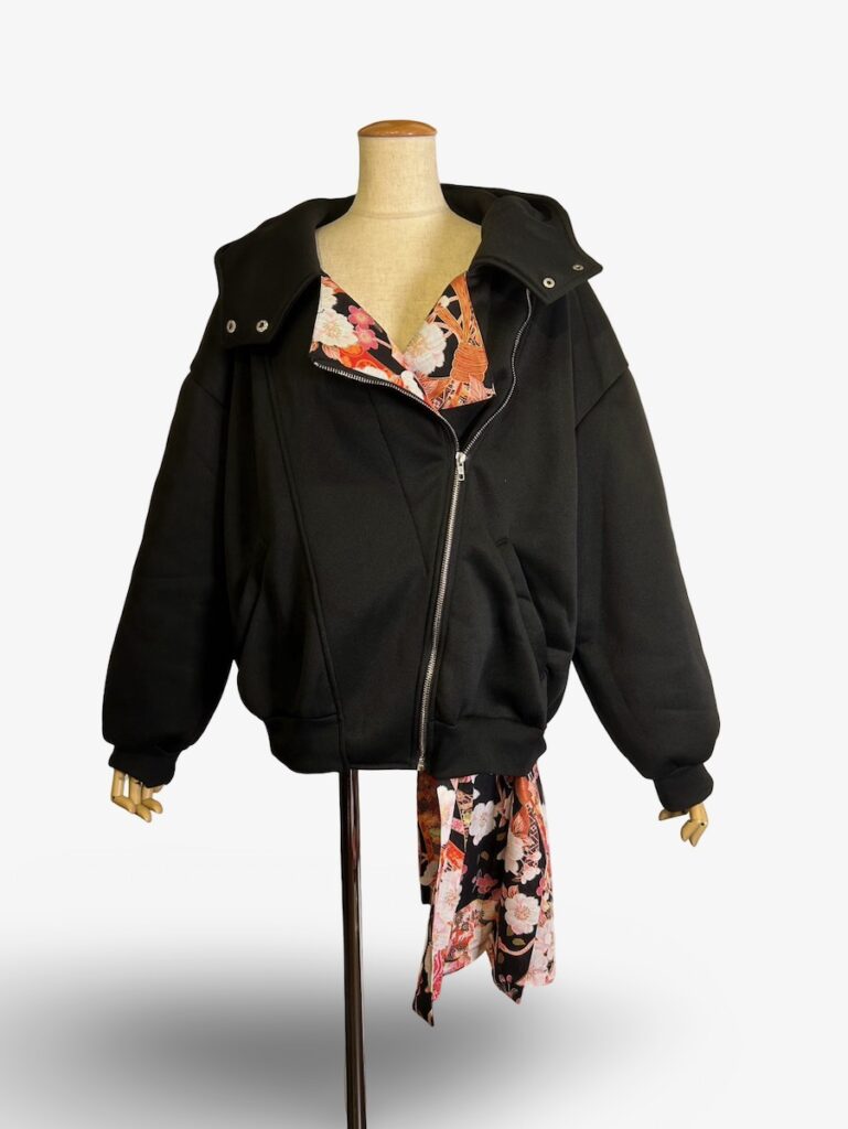 ライダースっぽい感じのパーカー。フードが付いております。腰にはプリーツスカートがついたようなデザインです。