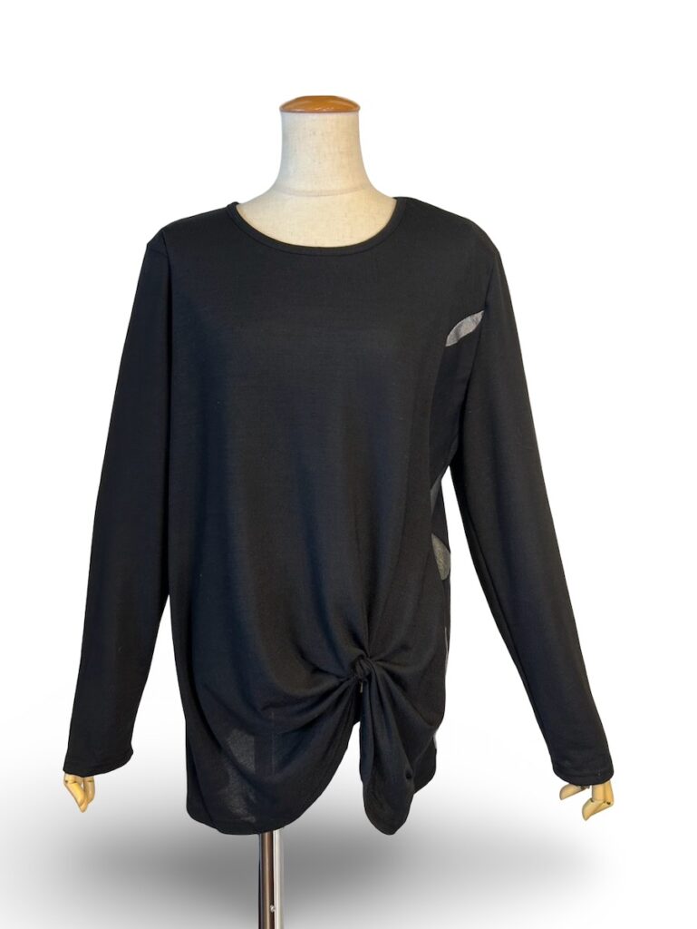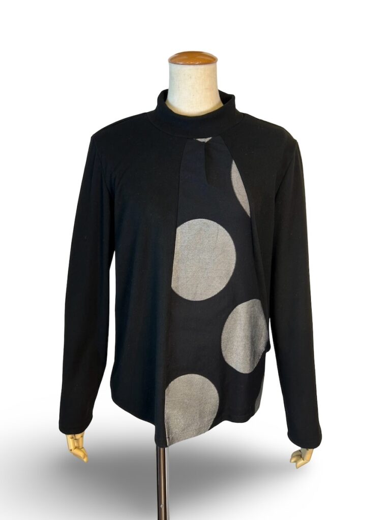 まずは、2つトップスをご紹介。左の裾をキュッと捻ったようなデザインです。左脇に水玉模様。
