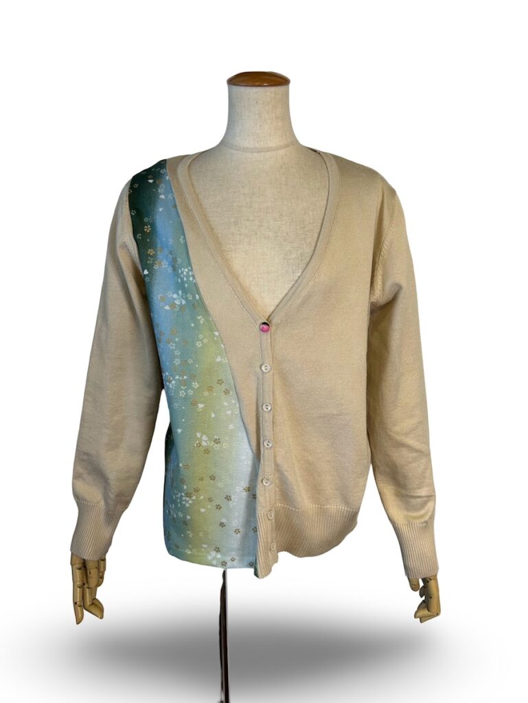で、春だからベージュのカーディガンも。右見頃に和柄ちゃんです。