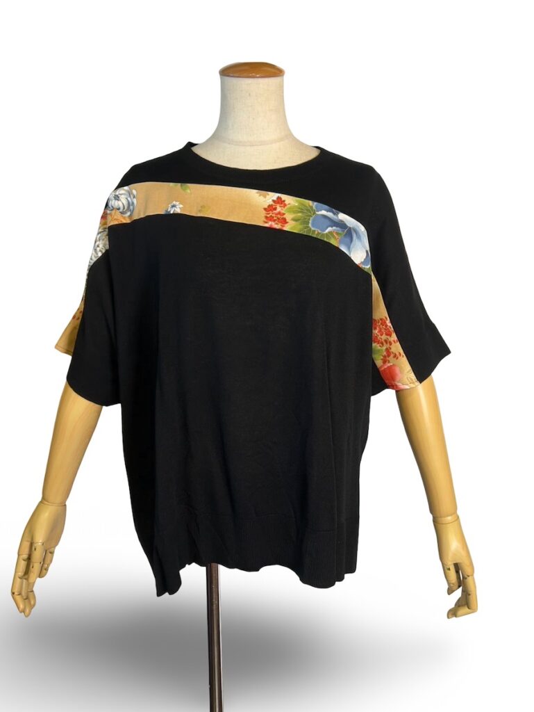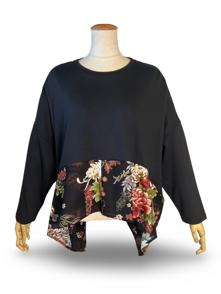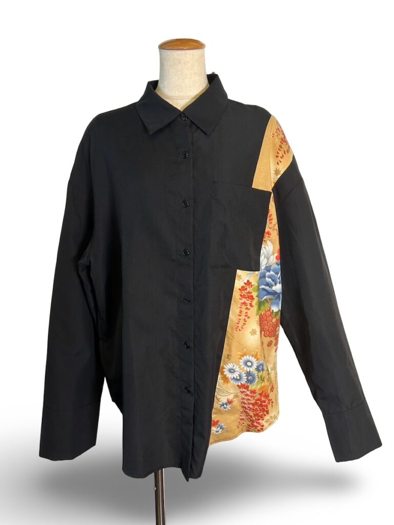 昼間のベージュ、夜の黒の和柄を使ったシリーズ。ウェブショップの子たちもご紹介しなきゃ。これは、シャツですね。