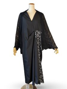 そろそろ薄手のニットのカーディガンも探していますよね?はい、ちゃんと作りましたよ。左側に切り替えた和柄で不思議なラインになりました。