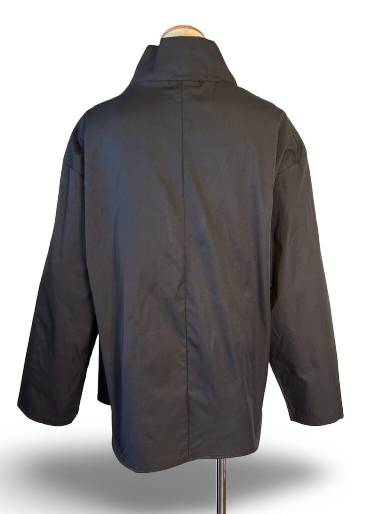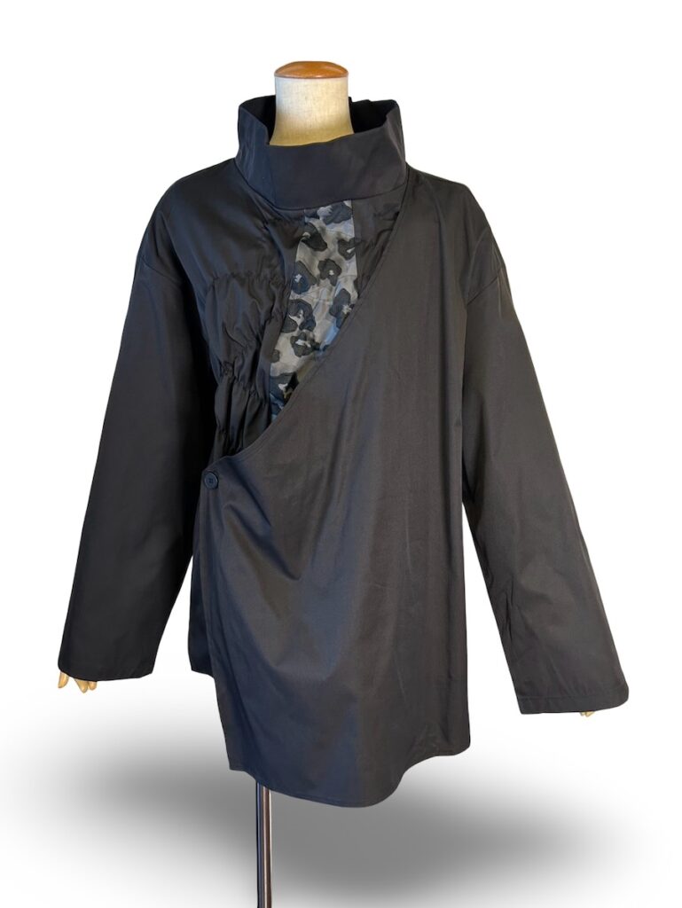 前が重なったハイネックな布帛のトップスね。ちらりと見える感じがモードでしょ?