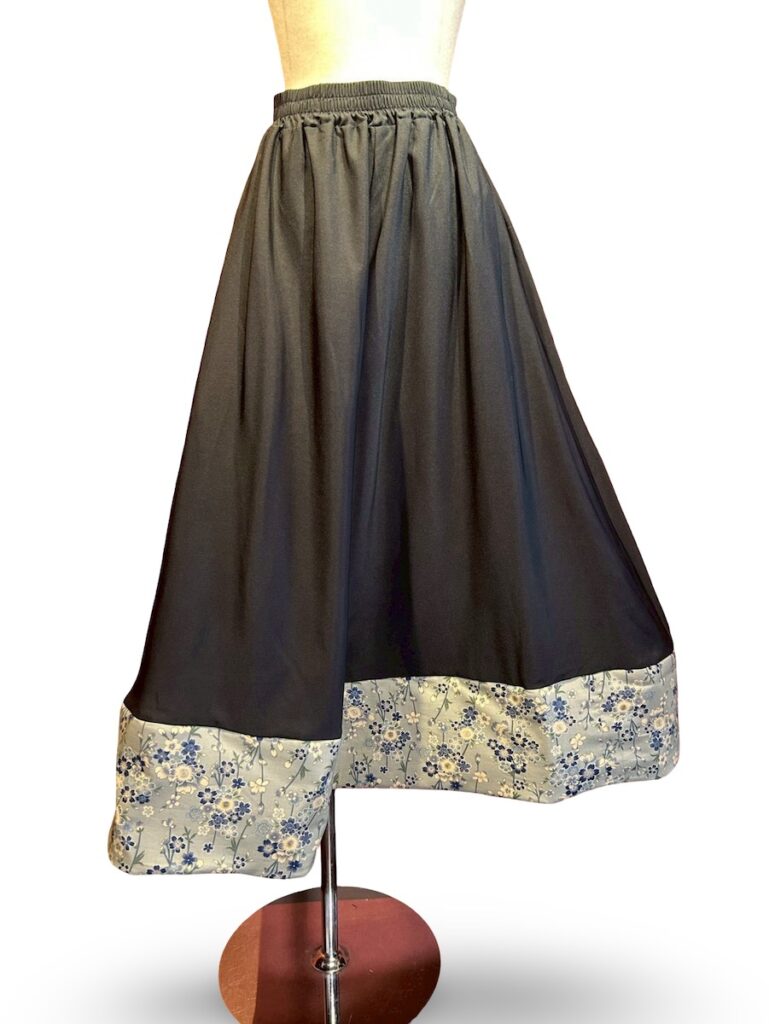 裾を少し張りのある生地と合わせてスカートの裾を大胆に広げて見ました。これも和の雰囲気を取り込んでいます。