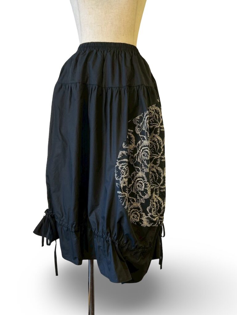 裾を紐でキュッとくしゃっとできるスカート。自分の好きな感じで留めて見てくださいね。