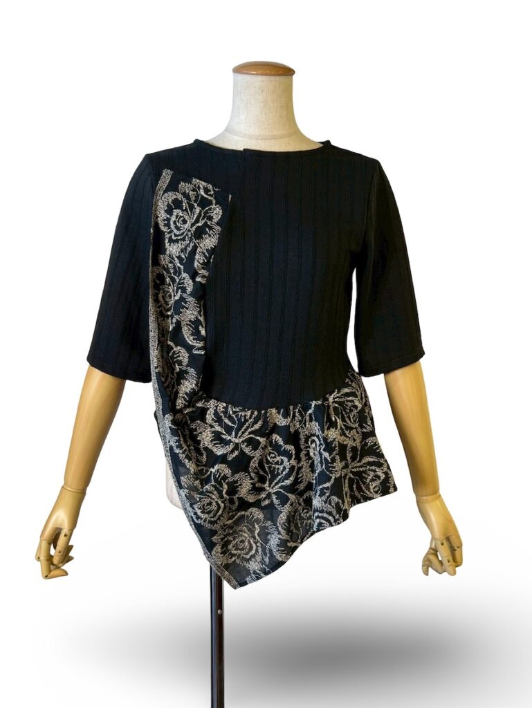 ちょっと裾が曲がった方向になっているトップス。着るとドレープになります。