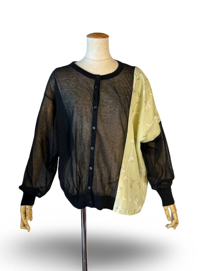 そろそろ薄手のニットのカーディガンも探していますよね?はい、ちゃんと作りましたよ。左側に切り替えた和柄で不思議なラインになりました。